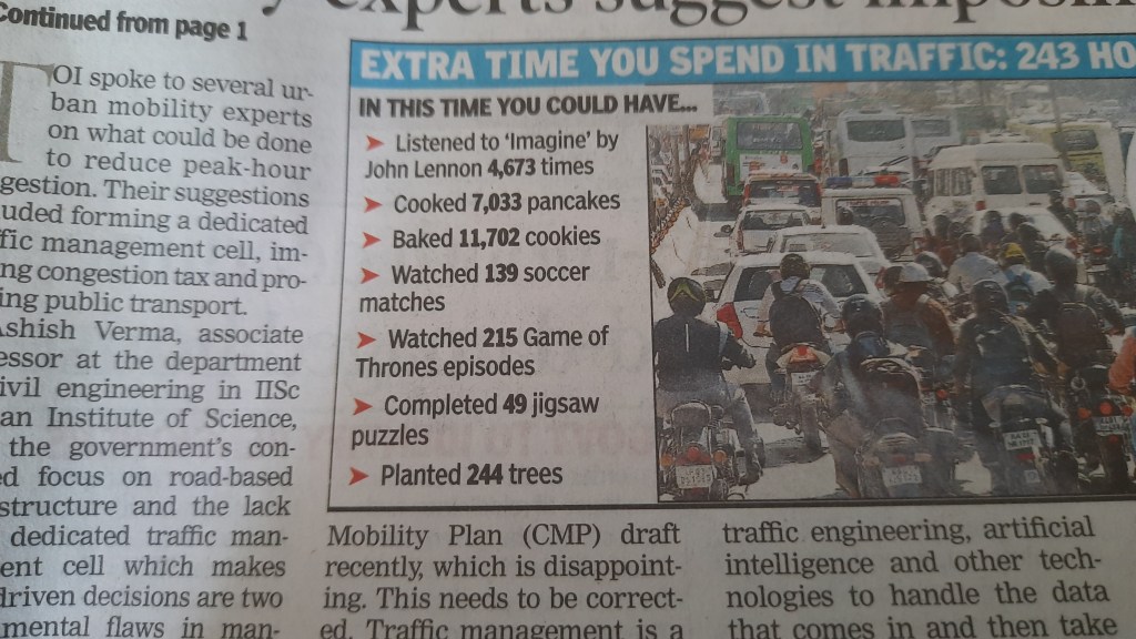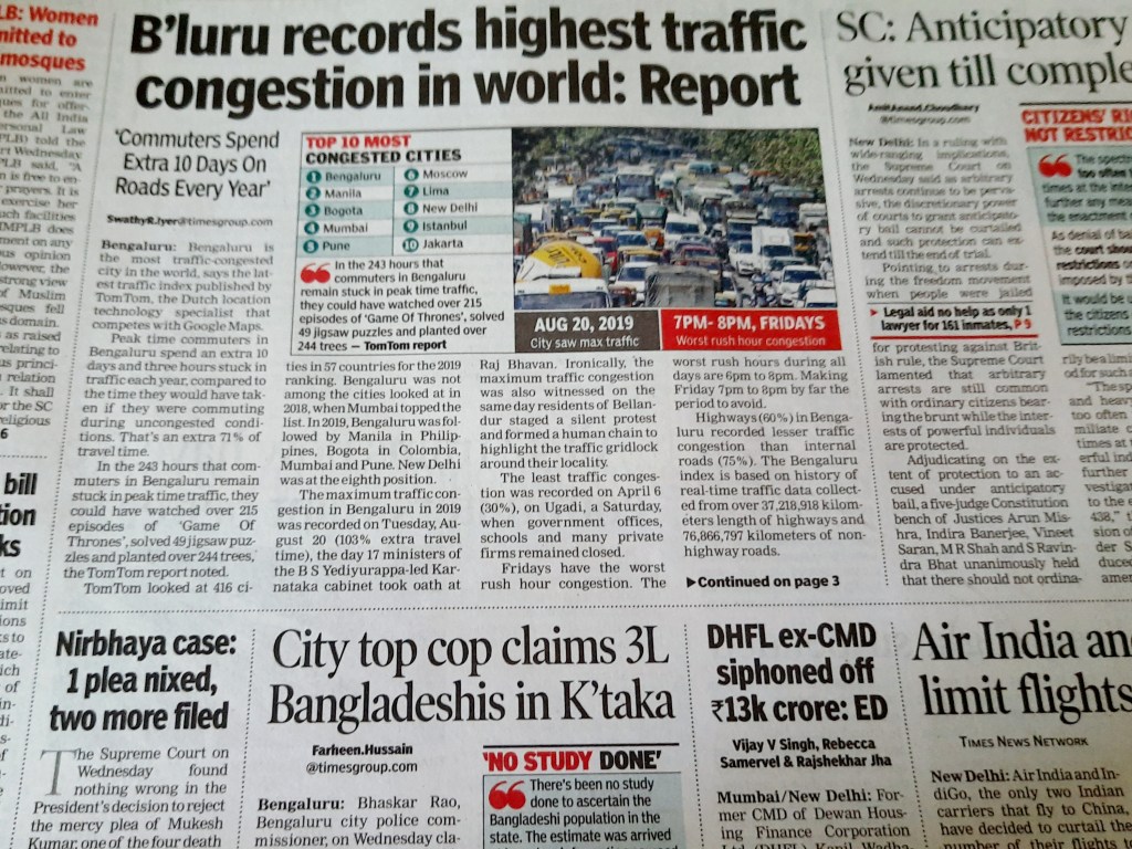 I’m not a morning newspaper person, but today’s header> ‘TomTom Traffic Index Special declaring our city Bangalore as with highest traffic congestion, globally…’ <got me gagging!