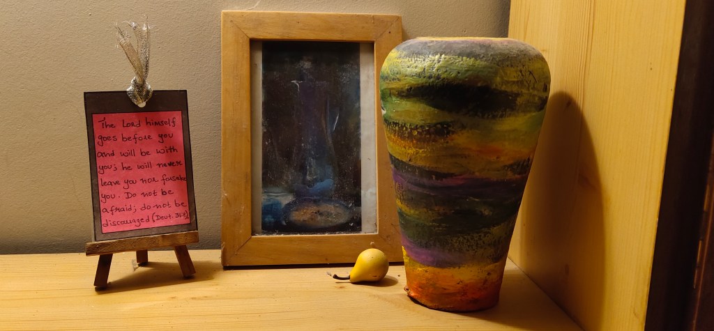 After her lunch of chicken curried in drumstick and gourd fried in tiny semicircles, sprouts and curd, oh soft hot rice and more dishes…. I can’t remember now, the heart turns to mush thinking of what she must have felt serving a spread like that and him not there, not having his meat roast, his chuckle in the centre of the room, and what hits me in the region of the cardia is that Thel will grieve till she heals and she will heal differently. I want to just snuggle with her and chat and not do anything in particular but we’ve all grown up so much these days, life had long routes and we took every turn. We learned to love from distances and lean close too and not stay; we learned to write short notes and socially distance, we learned manners and protocol, we learned to be afraid and trust the things we left unsaid,to stay that way. We visited and played little games like hide and seek, we died and rose again every now and then, in the way children play games pretending we are all grown up, when in fact deep within, little is exchanged. The world still tips on an axis, it still has its 2 hemispheres with Eskimos and tropical forests. Yes they are depleted, yes there are stalkers and pirates, there are viruses and rogue kings, and there are the children we are when we are sad or alone and the shadows of tomorrow lean in our doorways, we understand what they’ve been trying to teach us all along in Bibles and basic math: that no matter what, infinity will multiply. We are not thinking all that inside our heads as we leave my sisters long cool hall and gentle plants she grows in little pots among slender candle stand and memoirs of love glowing in the soft light as night deepens. It is winter already, an Indian winter chilly nippy in the tip of nose; a nice kind of chilly like crisp cool apples sliced to taste. Her face glows with words, she always did words well. I have them stuck in my throat, I’m not crying yet. Bravery hurts like hell: hers. Her books and paintings wait like forgotten friends, bowls, shirts, sheets, photographs and her way of keeping them all at bay; she gives me pieces of her self, a jar she painted, Tees for the kids, a shower curtain in snazzy black and white, an embroidered table runner, a plant, no two… they are no longer objects, they are Letters of yesterday and tomorrow bridged with today….. Whatever that means I will understand later. We forget to take pictures together. “Idiots,” Sam would’ve said with his characteristic grin, I miss him to pieces and she sees it, holds us close as if willing her mortal gut into me, knowing it cannot fill gaps, knowing that gaps are gaps. They are entities, angels of a kind that anesthetize human reactivity. Pain: she wears it like a bride wears jewels, they glow and settle in the skin in her… I don’t know how best to say it but its the way she looked standing there suddenly not alone, suddenly not just one person. He was there in her, his absence a Presence, beautiful in its overwhelming way….