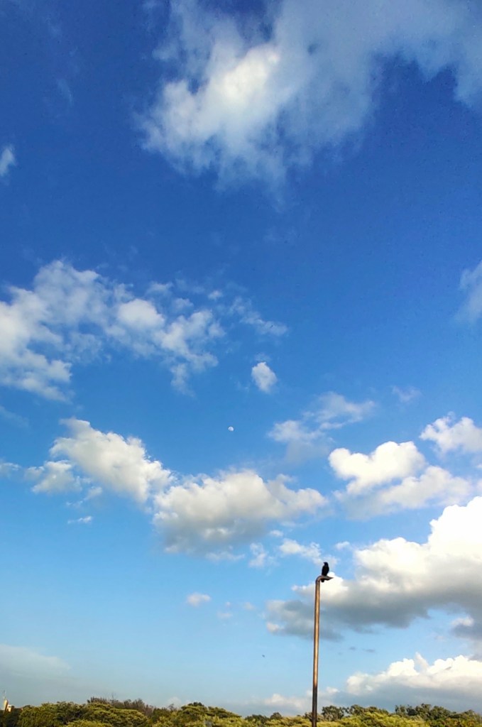 The bird was there waiting, asking to be noticed. I stood staring at him against that blue sky and early moon all stark naked Reminders that Life went beyond gravity!
