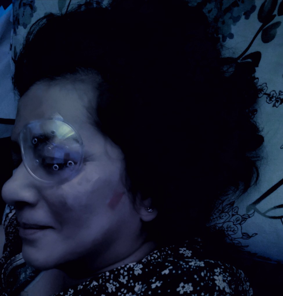 A livewire 5ft Optometrist tells me it will be over before I know it. Theater Staff frame my left eye with a device to keep it open. From inside the face wrap & topical anesthesia, it is like looking up through blue underwater. The Theater is cool. Literally. One of its kind in India. Sleek, minimal. Dual palmsized rectangular lights and another circular one shine thru’. “For a moment you won’t see anything, we’re putting it all in the centre..”