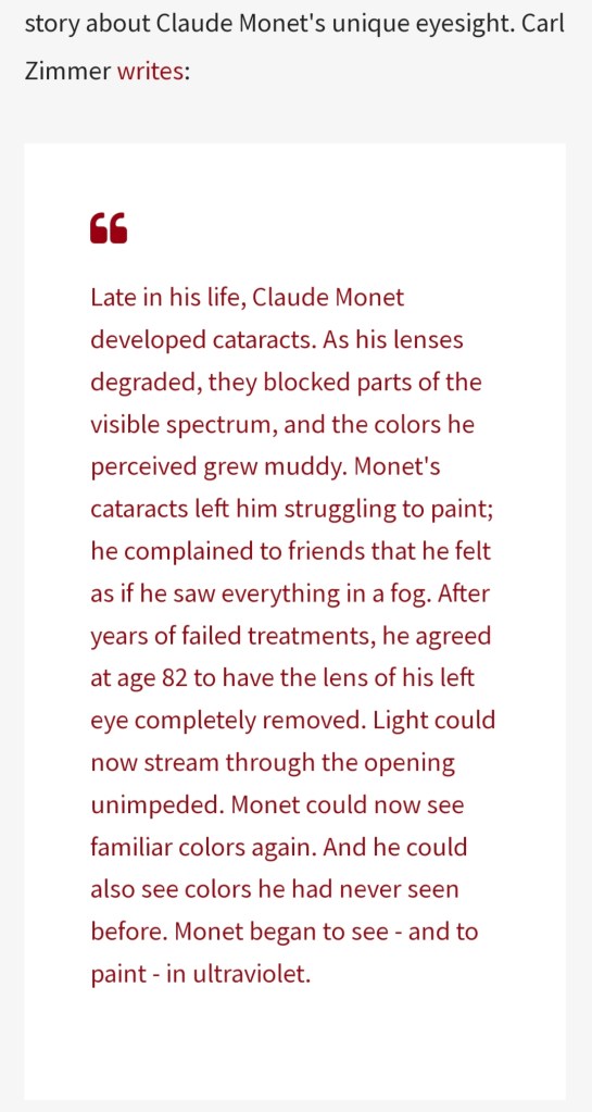 “What were those blue- greens at ….?” I ask in our first Follow up, 24 hours later. Dr.MSR shrugs. “I’ve never had eye surgery so, don’t know. But there are artists who painted muddy due to cataract.” ( I Googled and found this interesting Article on colour & cataracts👁)