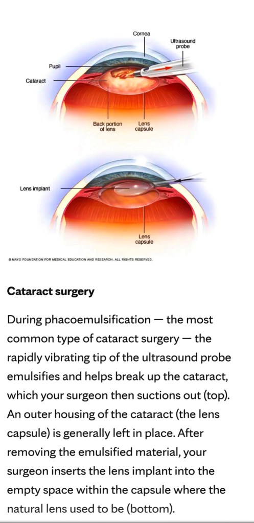 His words sink in as they drape my face. I’m sipping at relief. For years I have looked thru’ blurs, floaters, haloes, recently, even cats*! Now it seems like not such a bad eye, as we prepare for Phaco IOL surgery. The kind Doctor used this moment to give me some positive news; his voice is a ray of light. I exhale.