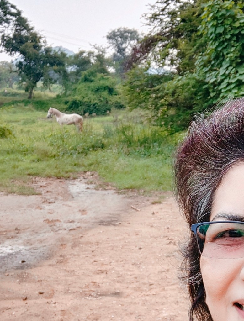 Notice white pony in background? ‘Surrendered Pony’ the Guide said. She walks with limp, cannot do speed; here at the Farm, its a new life.